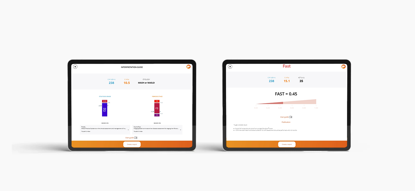 For Interpretation Guide: manually enter FibroScan® results or scan the QR code of the FibroScan® report so that the LSM and CAP™ values are entered automatically. Choose the etiology and You will receive the fibrosis stage and steatosis grade based on peer-reviewed publications.
